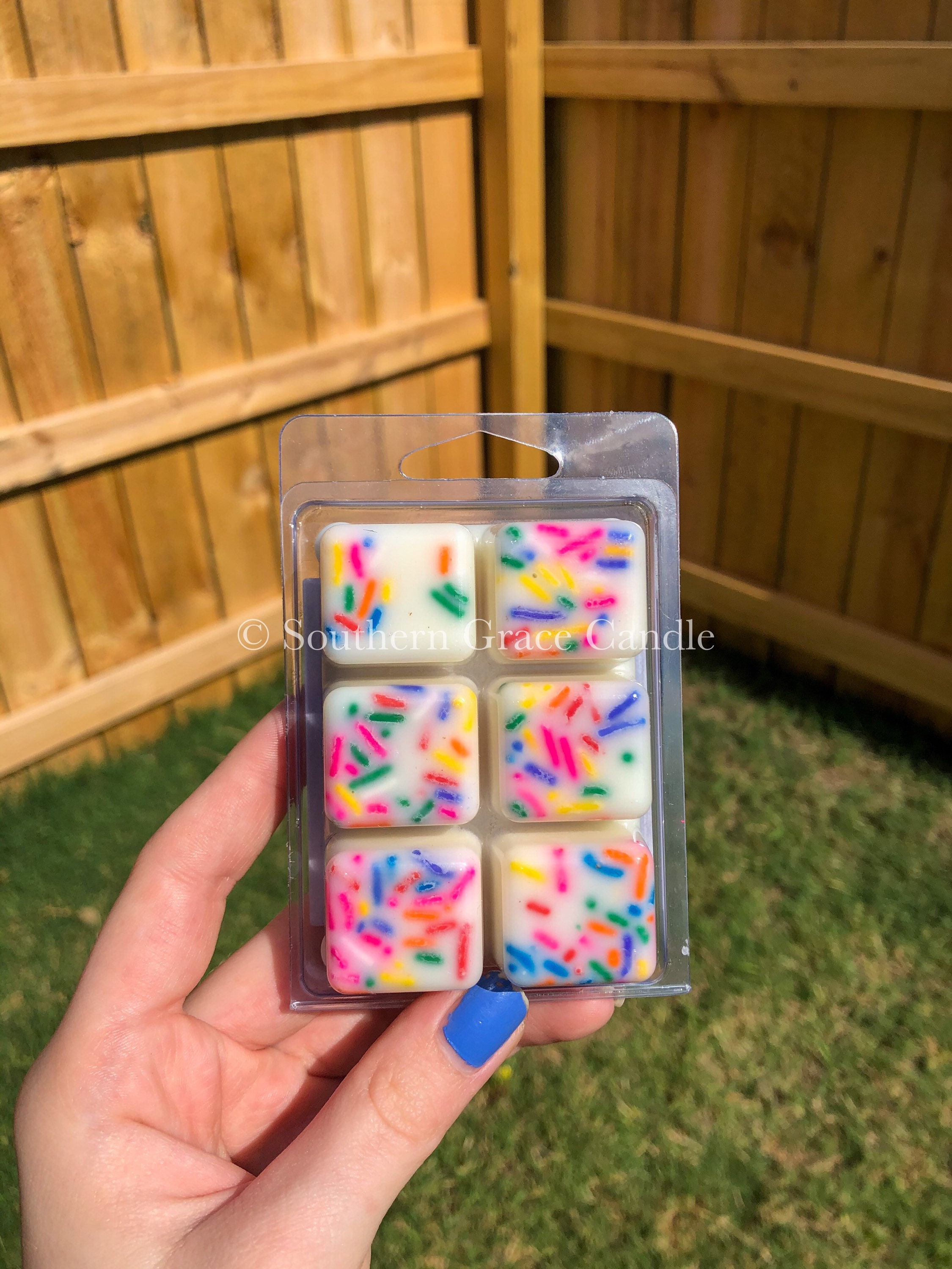 2.8 ounces of hand poured soy blend wax scented like vanilla cake & complete with REAL sprinkles. Perfect for a birthday gift, or just to melt whenever. 😉